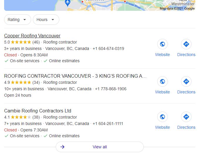 A sample is when you searched for “Roofing in Vancouver” and identified these listings. The local pack shows businesses with reviews and getting more finds in Google maps. If a customer looks into it further, they will check reviews and other services each business offers.