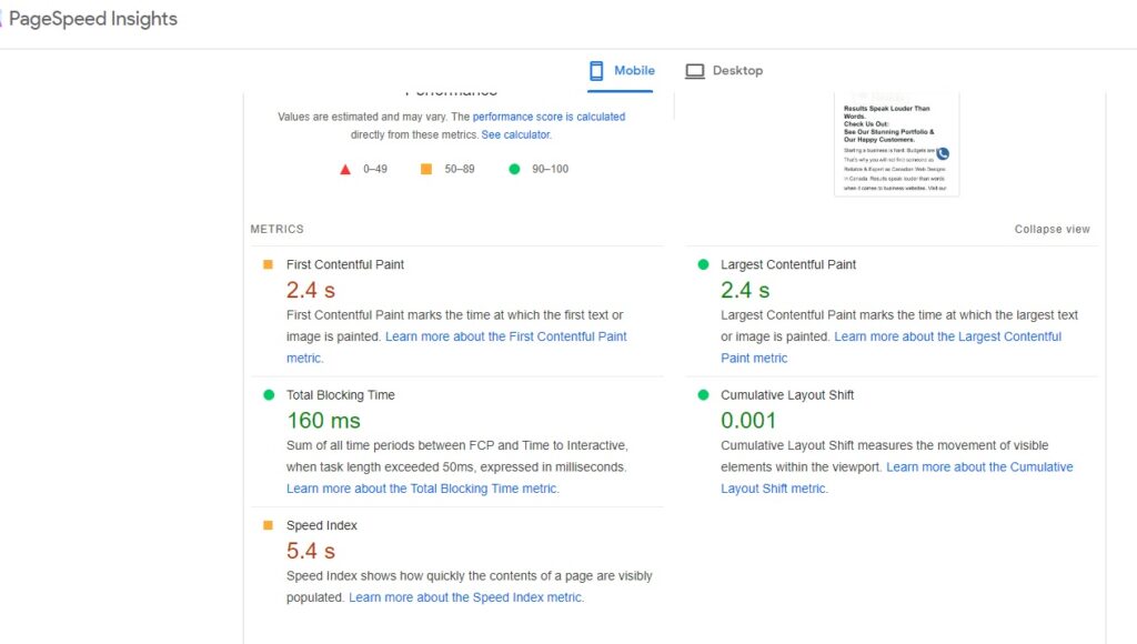 It’s important to keep in mind that PageSpeed Insights provides different ratings for mobile and desktop views of your website. This score difference stems from the fact that mobile devices have varying processors and internet connection speeds than desktop computers, leading to slower loading times. Furthermore, mobile devices often render pages in different browsers than desktop computers.